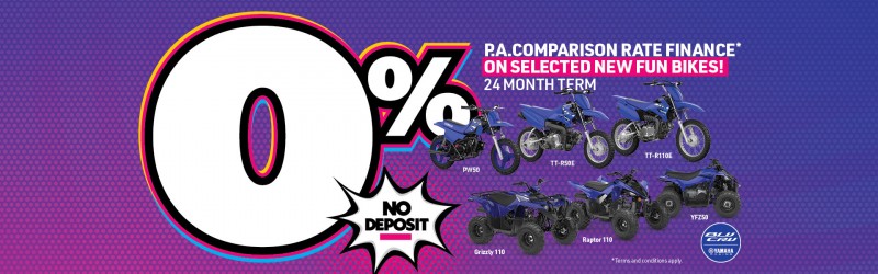 Fun Finance Yamaha is pleased to announce the 0% p.a. finance offer on selected new Fun Bikes and Fun ATVs. View Promotion