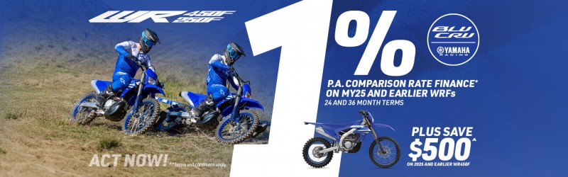 1 Percent WRF Benefit now with 1% p.a.* comparison rate finance plus factory savings on selected WR enduro models. View Promotion