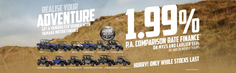 Realise Your Adventure Yamaha is pleased to announce 1.99% P.A. comparison rate finance* plus factory savings on selected side by side vehicles. View Promotion
